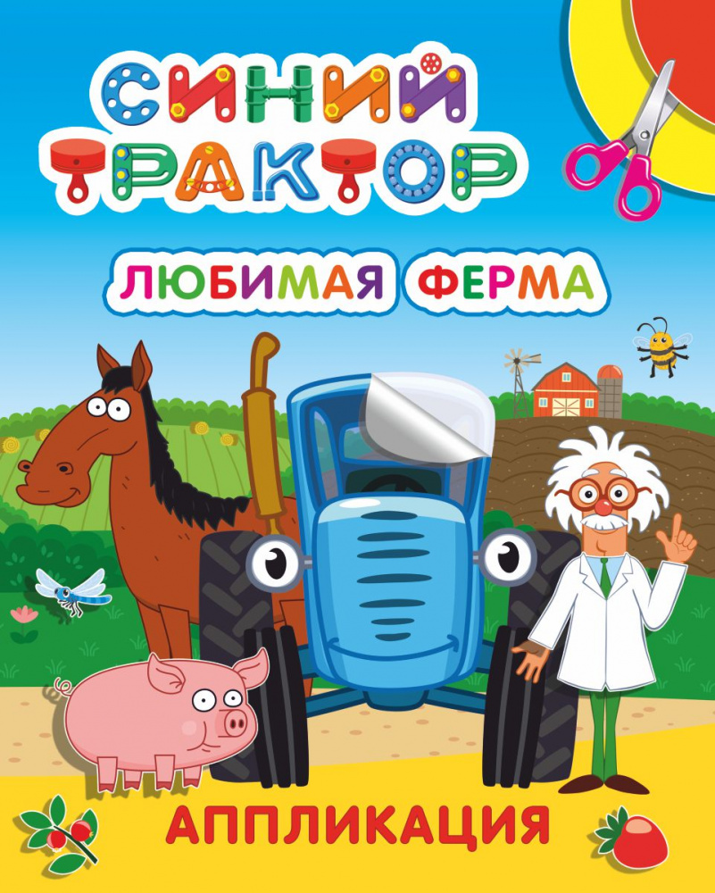 Книга-АППЛИКАЦИЯ в мягкой обложке, 20 х 25 см, 12 стр., 4 картинки-аппликации с героями м/ф "Синий трактор". Части рисунка нужно вырезать с одних страниц и приклеить на контур на специальных страницах.