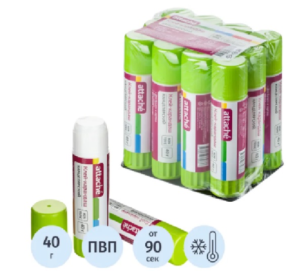 Клей-карандаш Attache предназначен для склеивания бумаги, картона. Основа клея содержит глицерин для легкого скольжения. Простой и удобный механизм, расположенный в основании стержня, позволяет легко выкрутить и закрутить столбик клея. Вес - 40 г. Форма корпуса: круглая. Не содержит цветовых пигментов (бесцветный). Клей морозостойкий. Выдерживает 1 цикл заморозки/разморозки при температуре до -18 °С.