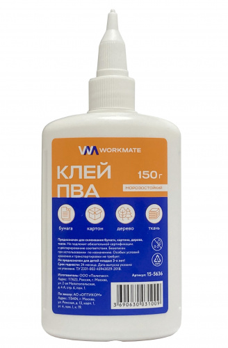 Клей ПВА Workmate предназначен для склеивания бумаги, картона, дерева, ткани. Морозостойкий, устойчив к высоким и низким температурам. Нетоксичен, универсален, не имеет запаха. Дозатор на пластиковом флаконе позволяет регулировать расход клея. Вес 150 грамм. Подходит для использования детям старше 3 лет.