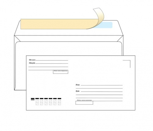 Конверт Е65 (110х220 мм) "Куда-Кому", синяя запечатка, отрывная полоса
