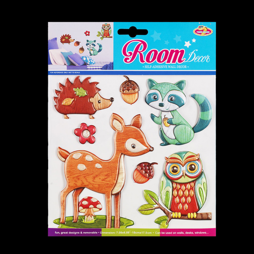 Набор состоит из семи ярких наклеек размером от 2.5 до 12 см. Рельефная поверхность выполнена с эффектом "под дерево". Данный тип наклеек очень хорошо крепится на стены, столы, зеркальные и стеклянные поверхности. Помимо оформления веселого уголка для Малыша, благодаря набору можно скрыть царапины, сколы на мебели и т.п. Наклейки быстро крепятся и легко снимаются, не оставляя следов. Безусловным преимуществом набора является его творческая составляющая. Ребенок легко может сделать свою картину, которая будет достойна рамки. Развитие моторики, принятие решения о композиции, первая творческая победа - все это очень важно для развития личности. Не рекомендуется использовать детям до 3 лет из-за наличия мелких деталей. Упаковка: картонная подложка с европодвесом запаяна в полибэг высокого качества.