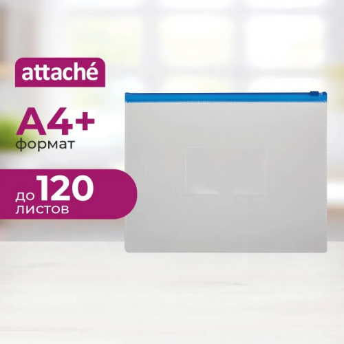 Папка-конверт на молнии изготовлен из ПВХ толщиной 160 мкм. Закрывается при помощи пластмассовой молнии. Имеет карман для визитки на лицевой стороне. Формат А4+. Цвет — прозрачный конверт, молния синяя.