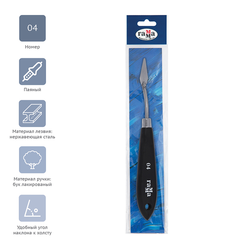 Паяный мастихин из нержавеющей стали с удобной плоской ручкой из натурального бука. Сварное соединение ручки и лезвия дает больший угол наклона мастихина к холсту, снижая вероятность случайного касания и смазывания краски.