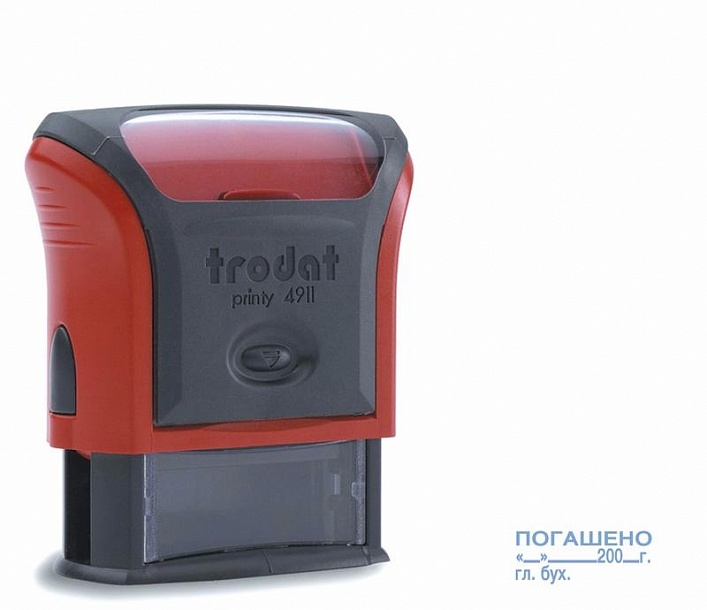 Стандартный штамп с одним бухгалтерским термином: "ПОГАШЕНО"__"__200_г гл.бух. Пластиковый корпус со встроенной сменной штемпельной подушкой может быть различных цветов: черный, синий, аквамарин, красный, оранжевый, желтый. Часто используют красную сменную штемпельную подушечку. Эти удобные штампы оптимального размера 38х14 мм идеальны для работы в офисе, бухгалтерии, на складе.