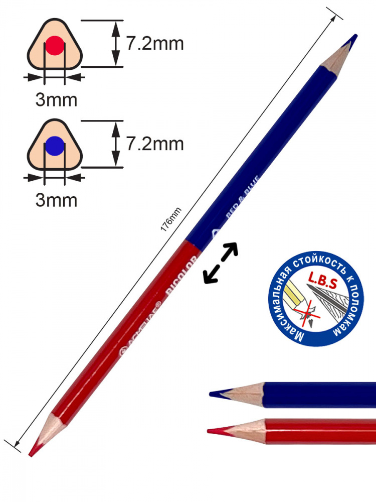 Качественные мягкие цветные разметочные карандаши. Цвет красно синий. Предназначен для рисования на бумаге разного типа. Двухцветный двухсторонний контрольный карандаш подходит для раскрашивания карт, проверки и исправления тестов, разметки на чертежах и схемах, выделения. Специальная проклейка грифеля для максимальной стойкости к поломкам - L.B.S. (связующая система грифеля). Грифель графитового карандаша полностью соединен с древесиной корпуса, составляя с ней одно целое, что предотвращает его поломки при падении и затачивании. Деревянный мягкий карандаш не царапает бумагу, оставляет четкие яркие линии. Треугольная форма карандаша удобно лежит в руке, подходит для правшей и левшей. Корпус из высококачественной древесины ровно и аккуратно затачивается стандартными точилками. Многослойное лаковое покрытие на водной основе - идеальный внешний вид. Запаянный верх – безопасно для ребенка. Длина корпуса 178мм. Прочный грифель диаметром 3 мм. Заточенный.