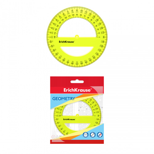 Транспортир из высококачественного пластика. Точная угловая шкала 360°; длина разметки основания составляет 12 см. Прозрачный неоновый желтый цвет.